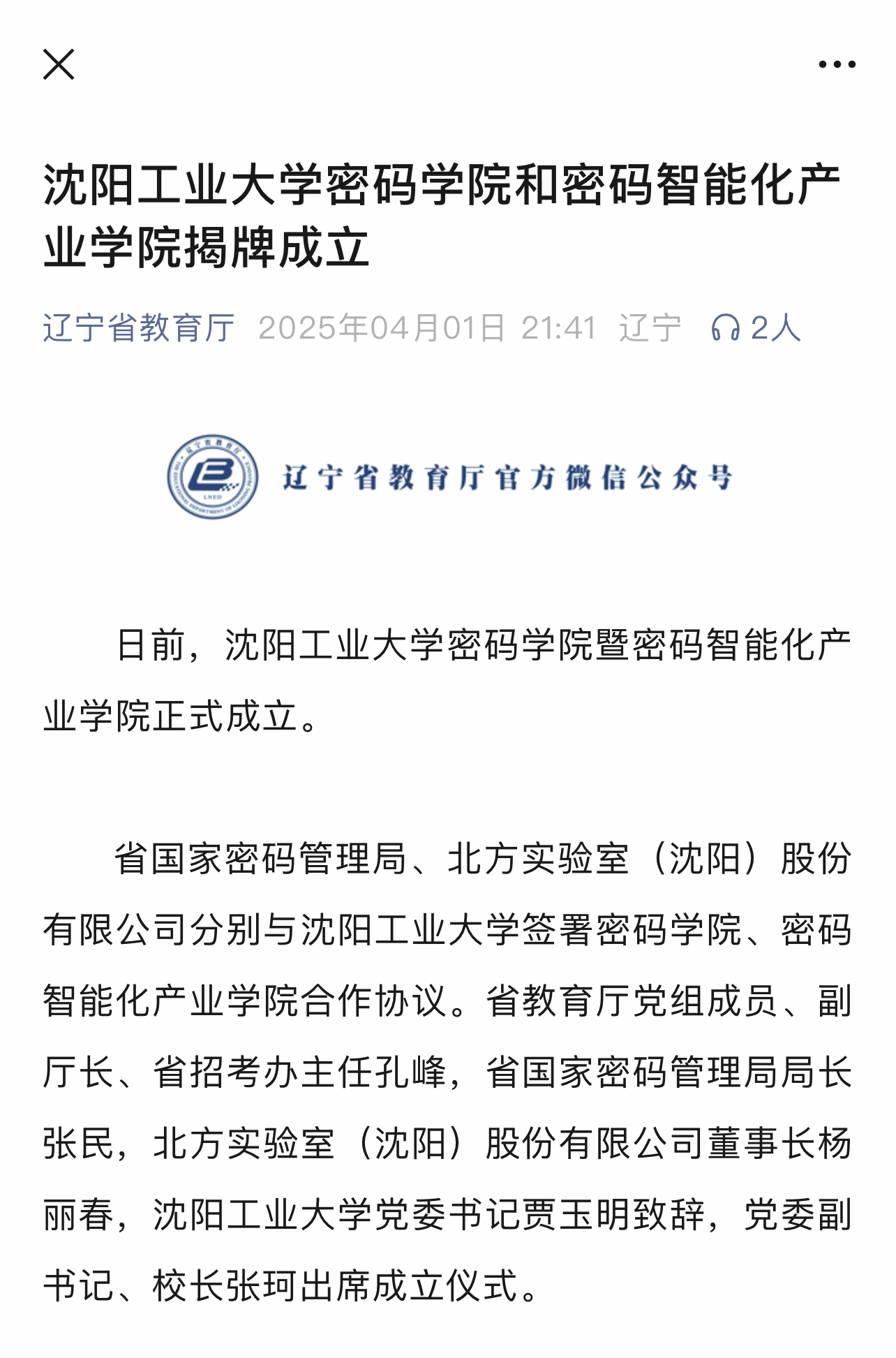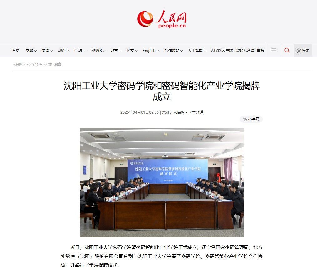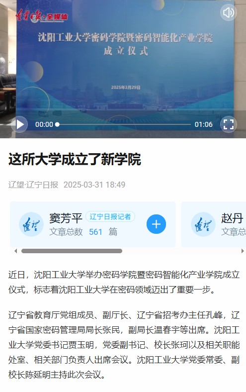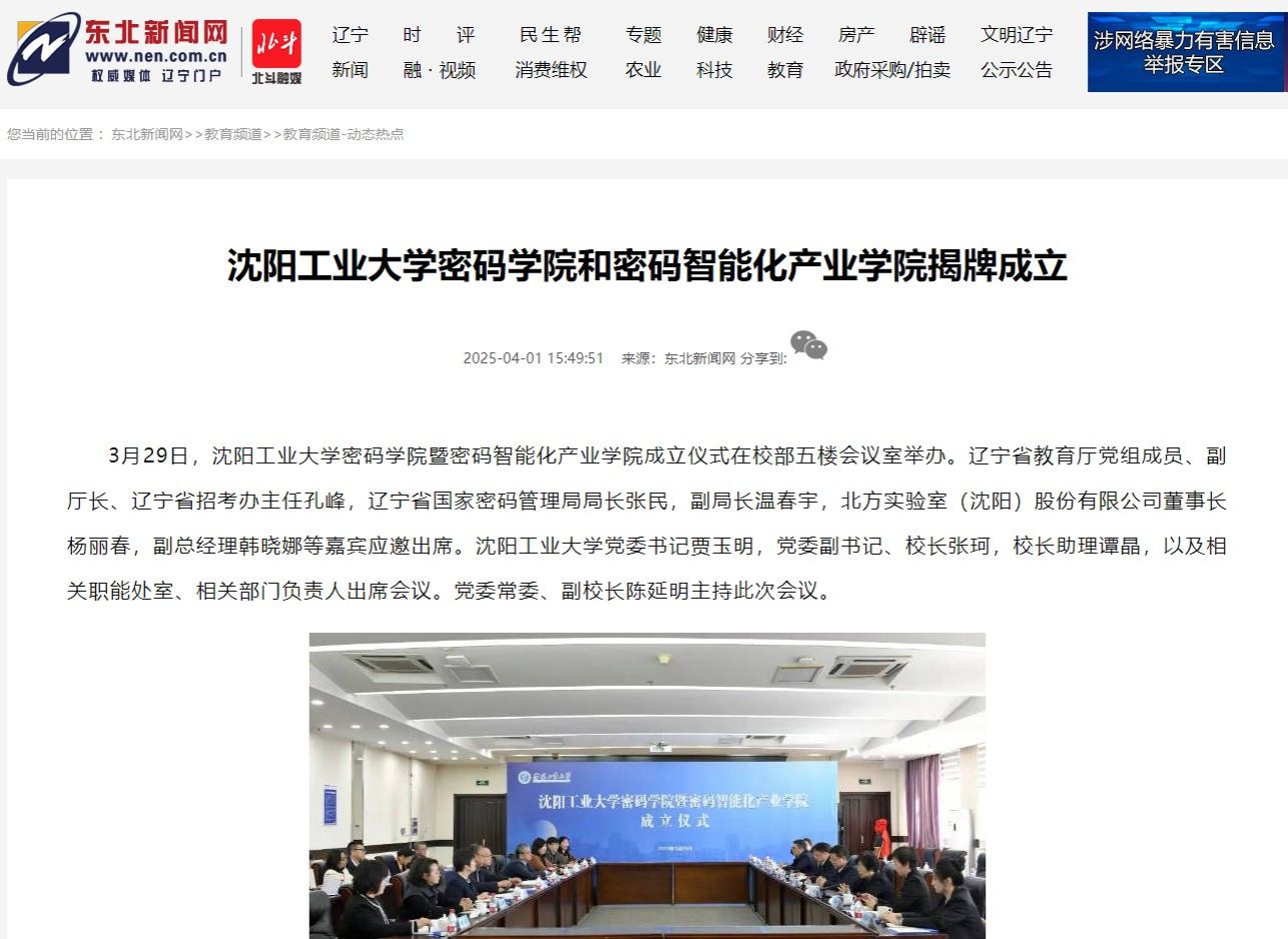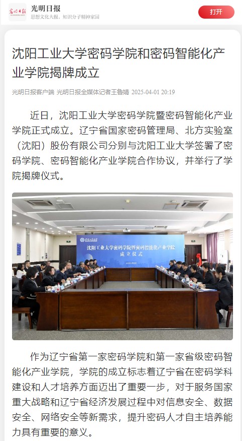 3月29日,我校密码学院暨密码智能化产业学院正式成立。辽宁省国家密码管理局、北方实验室(沈阳)股份有限公司分别与新葡萄88833官网amg签署了密码学院、密码智能化产业学院合作协议,并举行了学院揭牌仪式。多家媒体对此事进行报道。