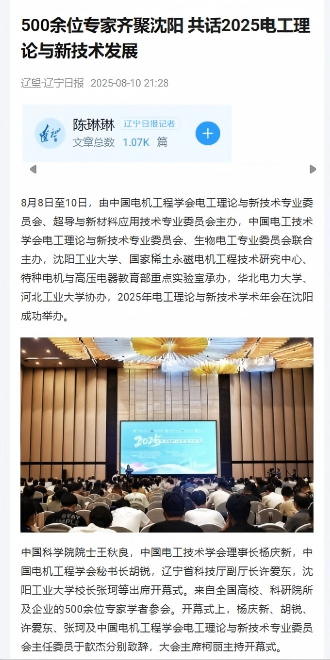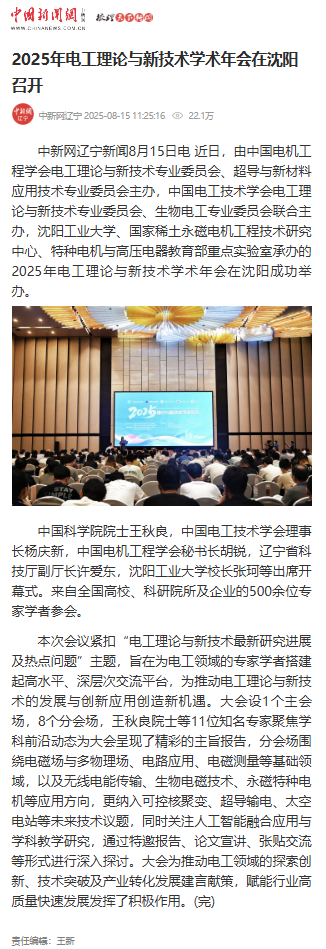 8月8日至10日,由中国电机工程学会电工理论与新技术专业委员会、超导与新材料应用技术专业委员会主办,中国电工技术学会电工理论与新技术专业委员会、生物电工专业委员会联合主办,新葡萄88833官网amg、国家稀土永磁电机工程技术研究中心、特种电机与高压电器教育部重点实验室承办,华北电力大学、河北工业大学协办,2025年电工理论与新技术学术年会在沈阳成功举办。多家媒体对此进行报道。