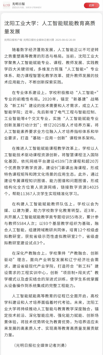 8月2日,光明日报以《新葡萄88833官网amg:人工智能赋能教育高质量发展》为题,全面介绍我校聚焦人工智能赋能专业、课程、教师发展、实践教学四大关键领域,多维发力筑强“人工智能+”专业体系、助力课程智慧化教学改革、提升教师发展的技术应用能力,不断创新探索实践。
