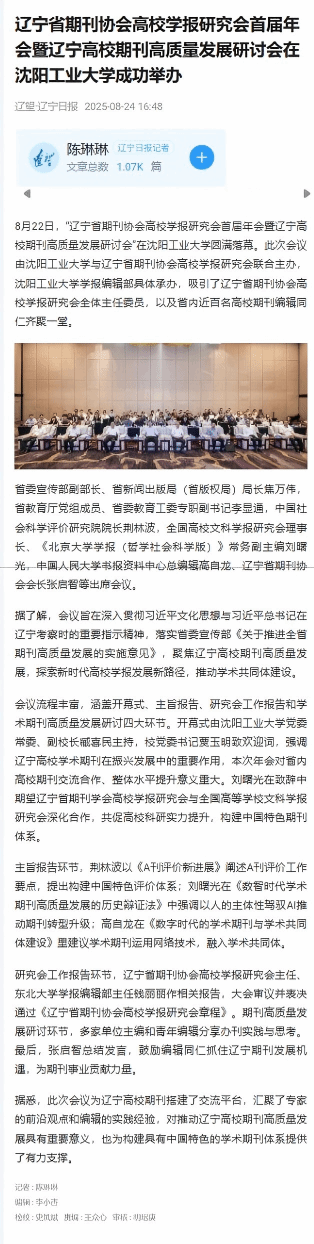 辽望·辽宁日报对学校主办辽宁省期刊协会高校学报研究会首届年会暨辽宁高校期刊高质量发展研讨会进行报道。
