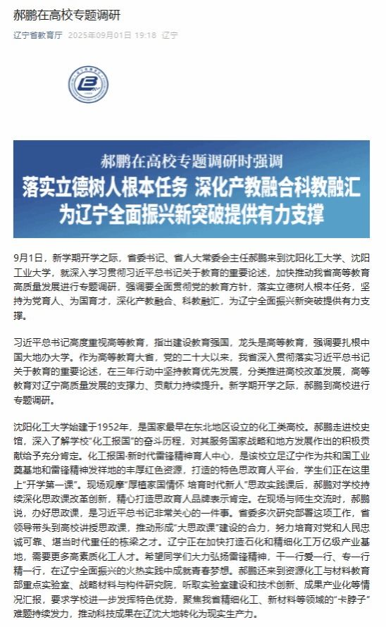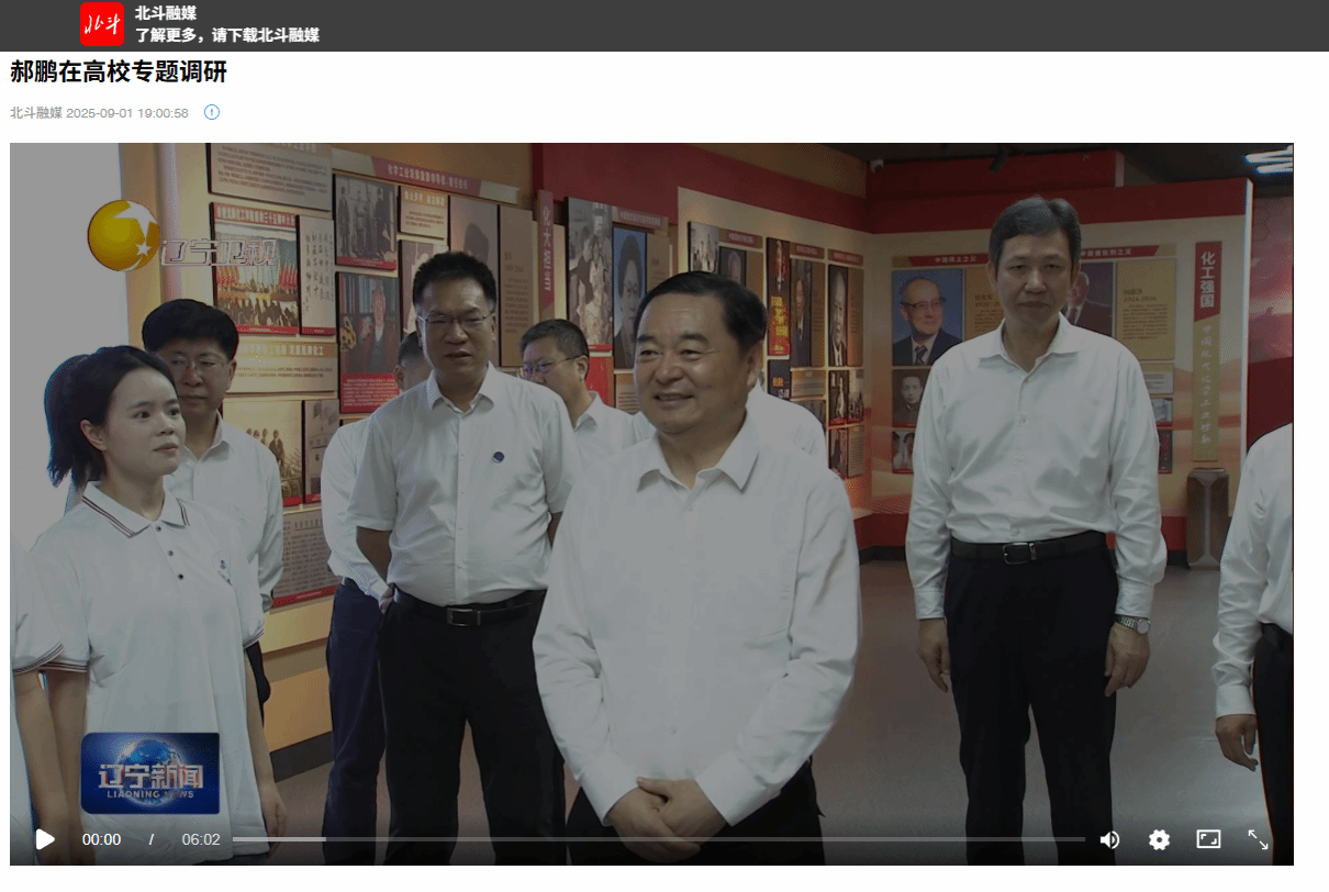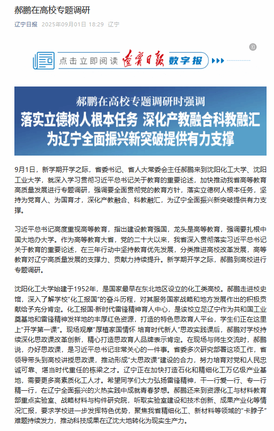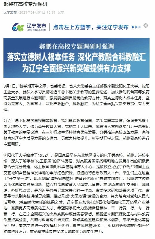 9月1日,省委书记、省人大常委会主任郝鹏来到沈阳化工大学、新葡萄88833官网amg,就深入学习贯彻习近平总书记关于教育的重要论述,加快推动我省高等教育高质量发展进行专题调研,强调要全面贯彻党的教育方针,落实立德树人根本任务,坚持为党育人、为国育才,深化产教融合、科教融汇,为辽宁全面振兴新突破提供有力支撑。多家媒体对此进行报道。